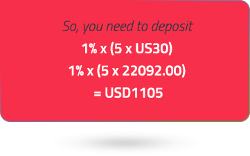now, Returning to trading, You have decided to buy 5 share US30 contract, Because you believe that US30 Prices will rise in the future. Your margin rate is 1% . This means that you need to calculate the total value of your position 1% Deposit into your margin account.